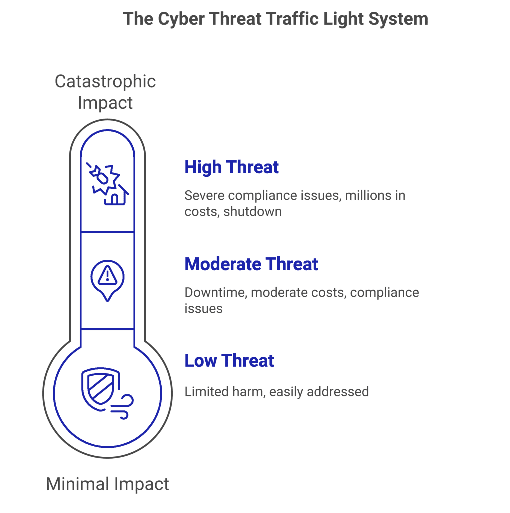 With the information you have gathered, you will now create a game plan. Analyse your findings and identify some strategies that can help close any gaps you discovered. Start with the most dangerous “Red light” threats first, along with compliance issues. These must be addressed immediately. Then, any leftover resources can be used to combat yellow and green threats.
